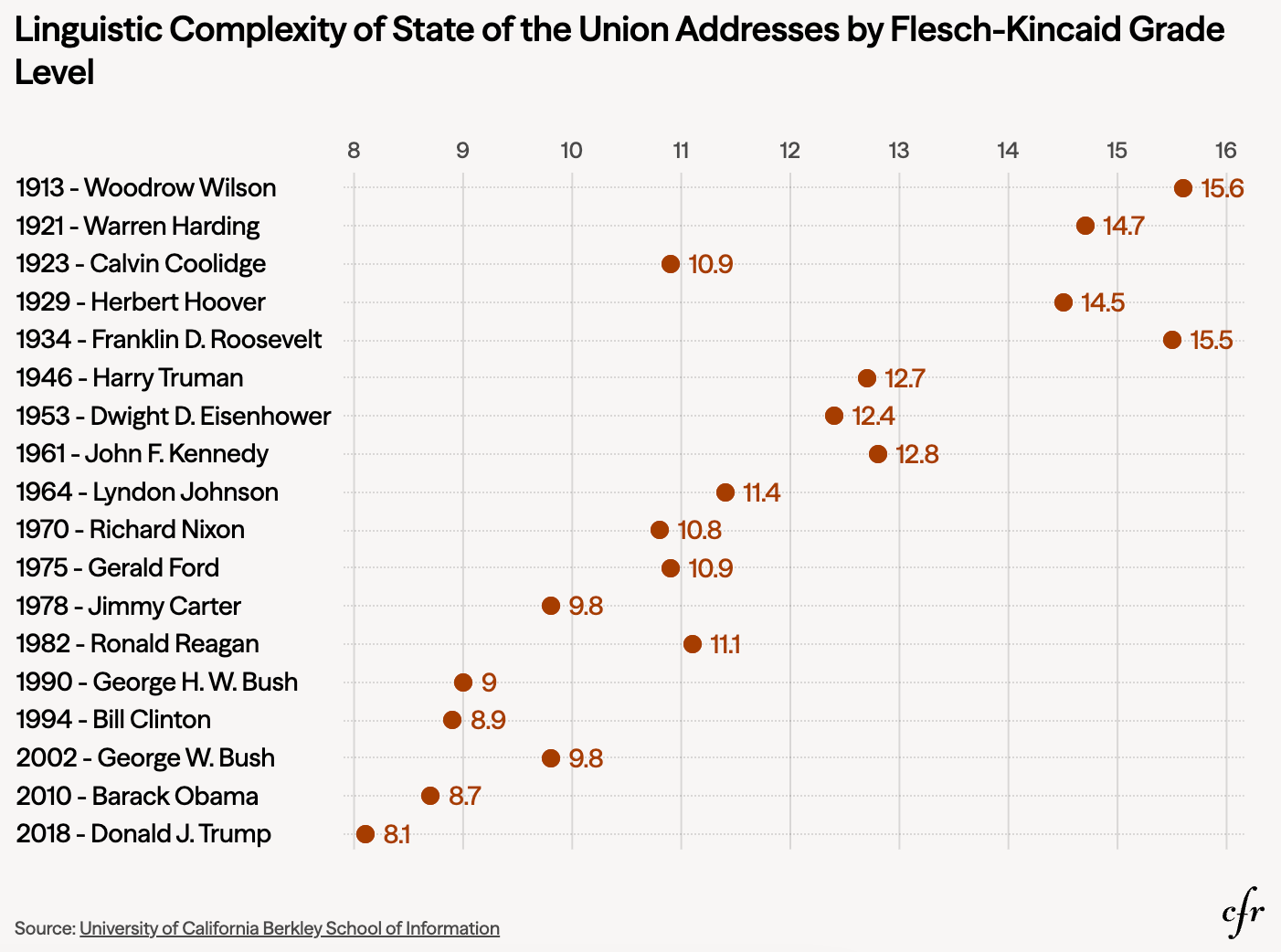 Over time, the linguistic complexity of addresses has declined. Early presidents spoke at what would now be considered college-level; modern ones tend toward eighth- or ninth-grade readability.