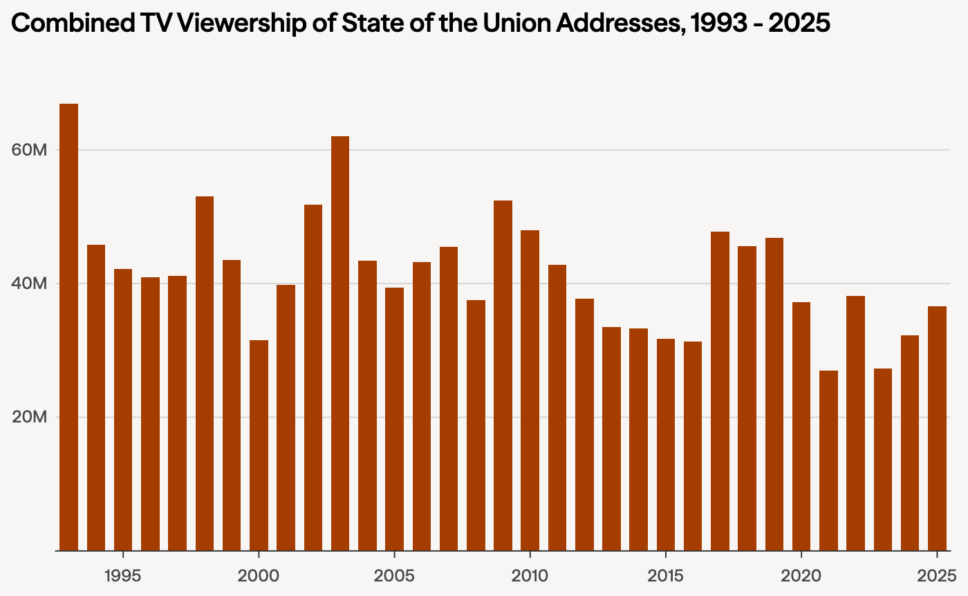 Bill Clinton’s 1993 address — technically not a State of the Union but treated like one — drew nearly 67 million viewers, the largest TV audience.