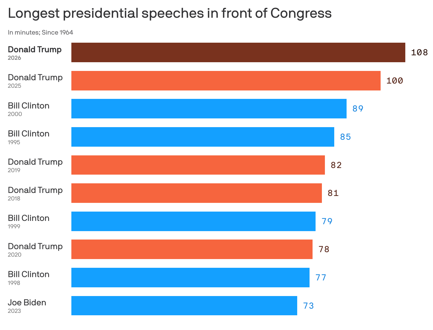 Trump’s 2026 address ran 1 hour and 48 minutes, making it the longest State of the Union on record in delivery time.