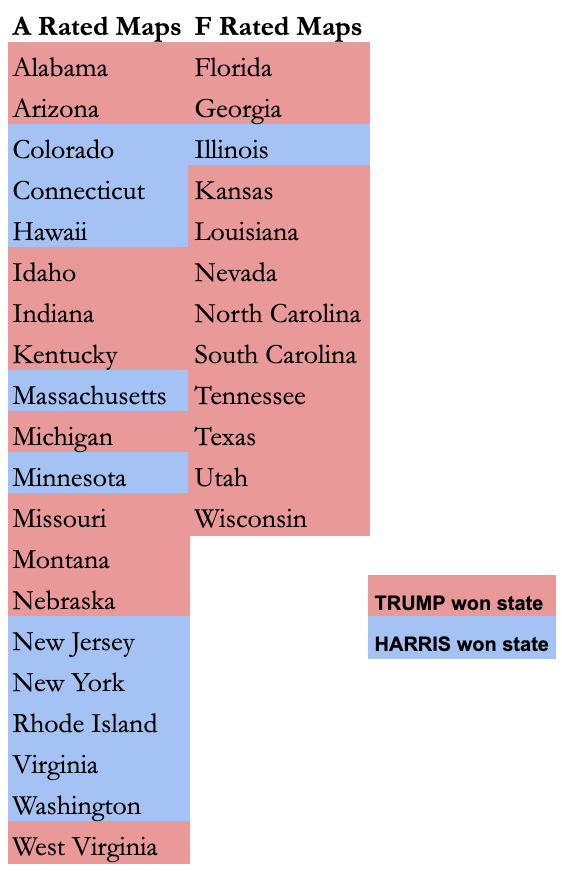 Of the 20 states that earned an A, it’s a clean split: 10 went for Trump, 10 went for Harris. Fair maps don’t inherently favor one party.