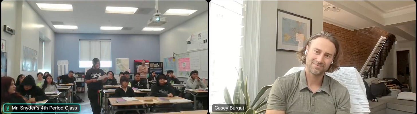 This was only affirmed when Professor Burgat and I arranged to have a live session with my 4th period class after they’d finished their projects. I asked for a few students to volunteer presenting their Amendments to him, and the session was the very definition of what many people in civic education call an “authentic audience.” I put my students in front of voters to discuss ballot measures, in front of their elected officials to discuss local problems, and now in front of an author (and university Professor) to discuss his book, but more importantly, their ideas. My students presented masterfully, Professor Burgat affirmed, challenged and listened to them, and the classroom felt abuzz. The digital divide seemed to (this time) allow us to do things that would be unimaginable otherwise.