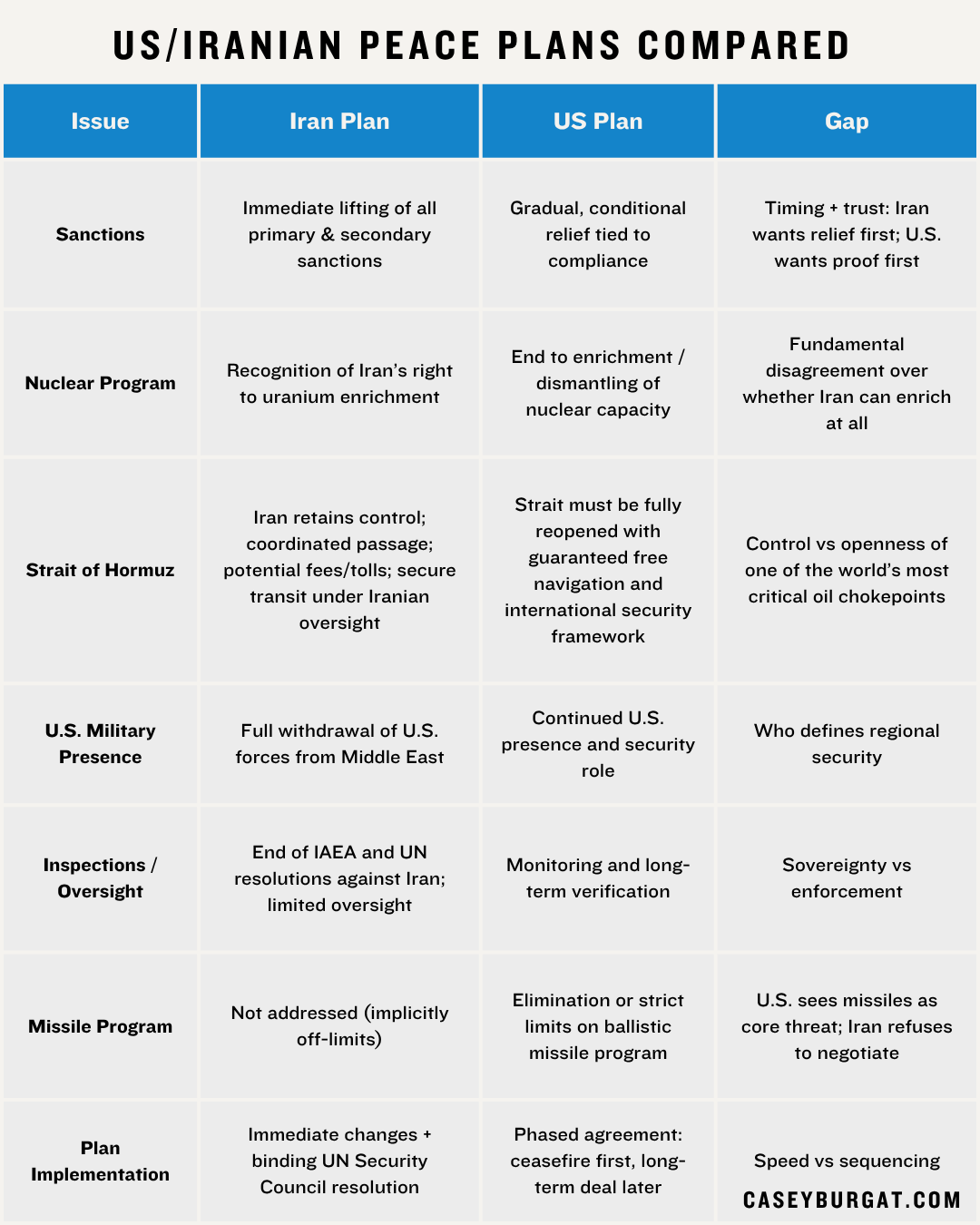 A Crash Course chart to quickly understand the gaps between the US and Iranian Peace Proposals